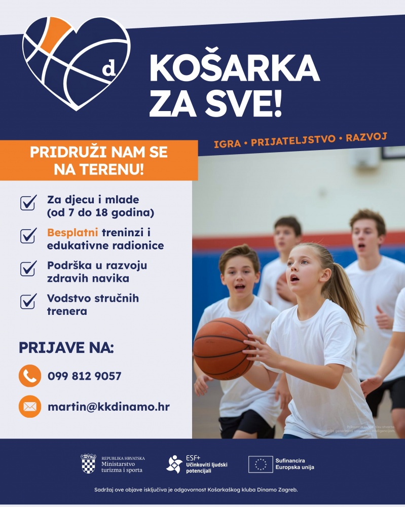 Projekt „Košarka za sve“ sufinanciran je sredstvima Europskog socijalnog fonda plus (ESF+). Za više informacija posjetite: https://kkdinamo.hr/projekt-kosarka-za-sve/.