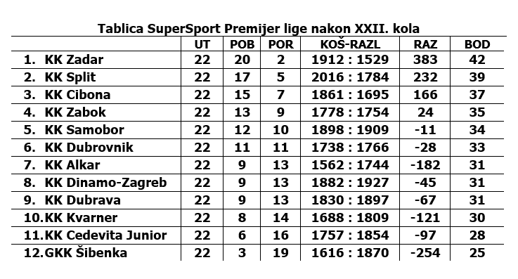 Nakon što su u ponedjeljak odigrane posljednje dvije utakmice 22. kola SuperSport Premijer lige u kojima je Dinamo slavio na Gripama kod Splita 94:99, a Zadar u Sinju kod Alkara 54:77, poznata je tablica nakon drugog kruga koja je definirala i raspored trećeg kruga natjecanja.