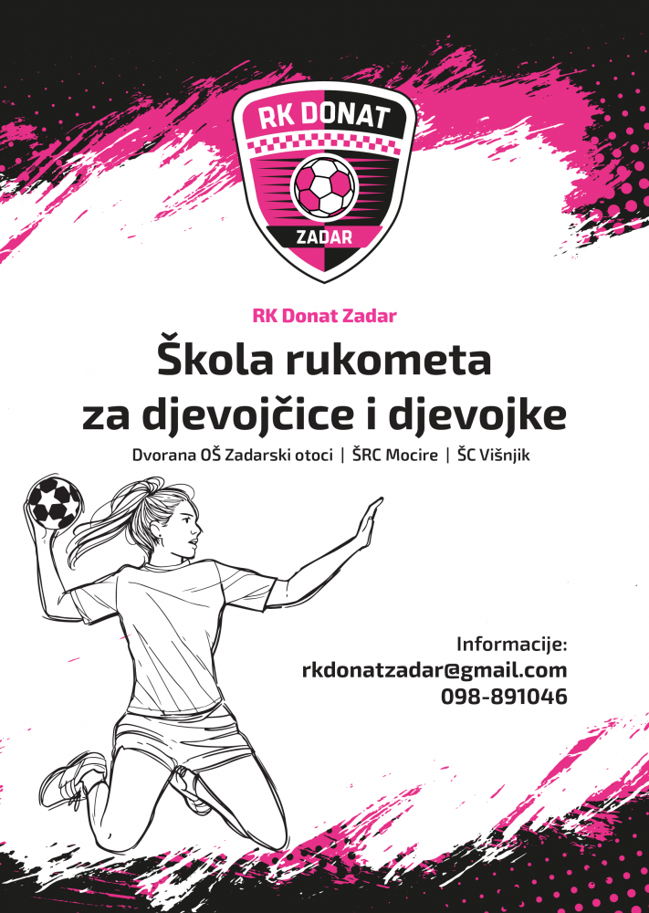 Rukometni klub Donat Zadar poziva djevojčice i djevojke svih uzrasta da se uključe u školu rukometa, upisi su u tijeku, a treninzi se održavaju na sljedećim lokacijama u Zadru: