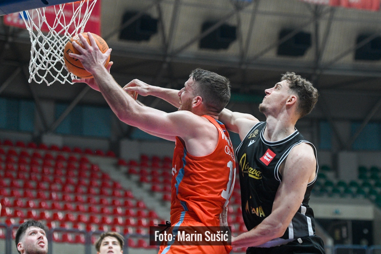 Unatoč ranom šoku, Juniori se drže u egalu te nakon trice Gaineya nakratko prelaze u vodstvo 13:11, no Dubrava ubrzo preuzima kontrolu, predvođeni razigranim Wrightom, gosti dobivaju prvu dionicu i odlaze na 18:24. Početkom druge četvrtine Dubrava nastavlja u visokom ritmu i odlazi na 20:31, što prisiljava trenera narančastih na rani timeout. Reakcija domaćih bila je dobra — serijom 9:0 vraćaju se u utakmicu i spuštaju na -2, a Vranković pritom ubacuje važnih pet poena. No završnica poluvremena opet pripada gostima, Čolak i Vuković pogađaju ključne šuteve i Dubrava na predah odlazi s prednošću od +7, 35:42.