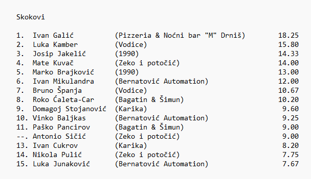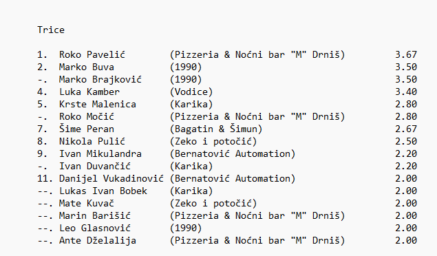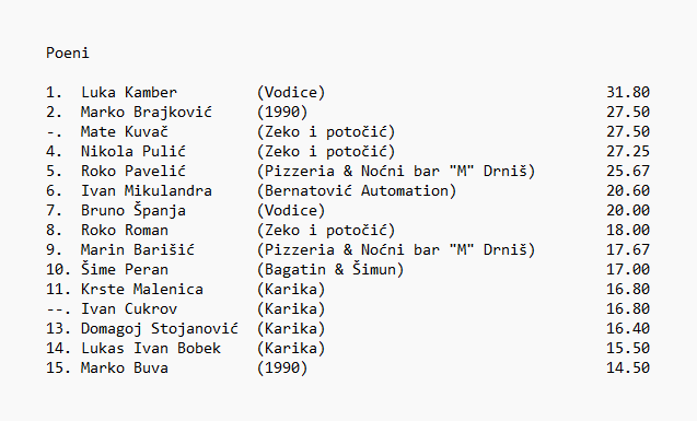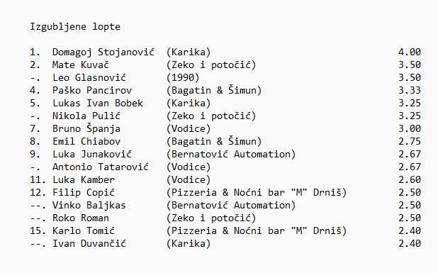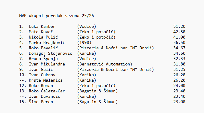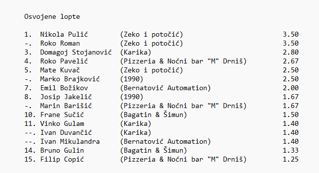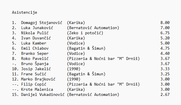 Pizzeria & Noćni bar "M" Drniš: Močić (15), Barišić (14), Ljulj, Copić (16), Tomić (11), A. Dželalija ( 8 ), I. Galić (11)