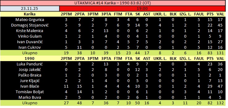Prvi nedjeljni duel bio je ligaški klasik između Karike i KK 1990. Uvertire u ovaj dvoboj je bilo s više strana, odakle početi? Krenut ćemo od Karike. Branitelj naslova, poodavno poznat po gradnji momčadi po principu mala-četa-ali-odabrana, ove sezone nastupa u još užoj rotaciji. Mlađi igrači su nerijetko odsutni zbog studentskih obaveza, ali pravi izazov Karikašima je friška novostvorena situacija u našoj jedinoj i voljenoj Šibenci, gdje je prošlosezonski MVP Franko Netjak Kalpić u najkraćem mogućem roku - spletom raznoraznih okolnosti - dobio priliku voditi Narančaste s Baldekina. Da situacija po Kariku bude kompliciranija, kao svog pomoćnika odabrao je - a realno, moralo je tako i nikako drugačije - svog dobrog Tetka Ivana Duvančića. Večer prije ovog dvoboja Netjak i Tetak su upisali svoju prvu pobjedu u državnom prvenstvu. Bravo, momci! I dok je Netjak, van natjecateljskog ritma, u društvu još jednog trenerskog produkta Karikine škole, Pere Maleša, s tribine aktivno pratio igru svojih suigrača, Tetak je još jednom bio važna karika (he he) u događanjima na terenu. S druge strane, 90ersi pomalo tradicionalno ulaze u prvenstvo nešto sporije. Čudnovati Marko Brajković se, uz sijaset uvreda na njegov račun od strane manje-više svih prisutnih, u posljednji trenutak javio s porukom o neodgodivim privatnim obvezama. Zato se po prvi put u sezoni pojavio popularni Luka Pandurić Panda, ali i veliko pojačanje s prvog mini prijelaznog roka, Ivan Blaće. Bleki i Panda su tako ponovno u istom dresu nakon više od osam godina, ali po njihovoj suradnji na parketu već u prvim minutama utakmice se nikako ne bi reklo da je prošlo toliko puno vremena. Upravo na krilima ovog dvojca 90ersi su prvi potegli, revolveraškom terminologijom govoreći. Karika je imala velike probleme u branjenju ovog dvojca, a nisu uspijevali pronaći ni pravi ritam napadački. Na poluvremenu je bilo +12 u korist 90ersa (38:50). No, u drugom dijelu kreće nalet Karike, koja je počela igrati svoju brzu igru, i to im je malo-pomalo donosilo smanjenje zaostatka. U samoj završnici smo gledali pravi triler, pri rezultatu 77-77 obje momčadi su imale po jedan napad za pobjedu u regularnom vremenu, ali nisu uspjeli poentirati te se otišlo u produžetak. Dodatnih pet minuta je bilo iznimno čvrsto, a koncentracija je bila na sreći Karikaša koji slave u još jednom klasiku ŠRKL-a. Prvo ime pobjedničke momčadi bio je Domagoj Stojanović, kojem je za dlaku izmaknuo još jedan triple-double (22 poena, 14 skokova, 9 asistencija, 4 ukradene lopte), dok su po 15 poena dodali Mateo Grgurica (uz 6 skokova) i Duvančić (7 skokova, 5 asistencija, trice 3/7). Kod 90ersa prvo ime je bio Blaće (29 poena, 10 skokova, šut za dva 11/15), a mrvicu slabiji učinak imao je Pandurić (23 poena, 9 skokova, 7 asistencija, šut za dva 7/8). Dvoznamenkast je bio i Tomislav Boljat (11 poena, 6 skokova).